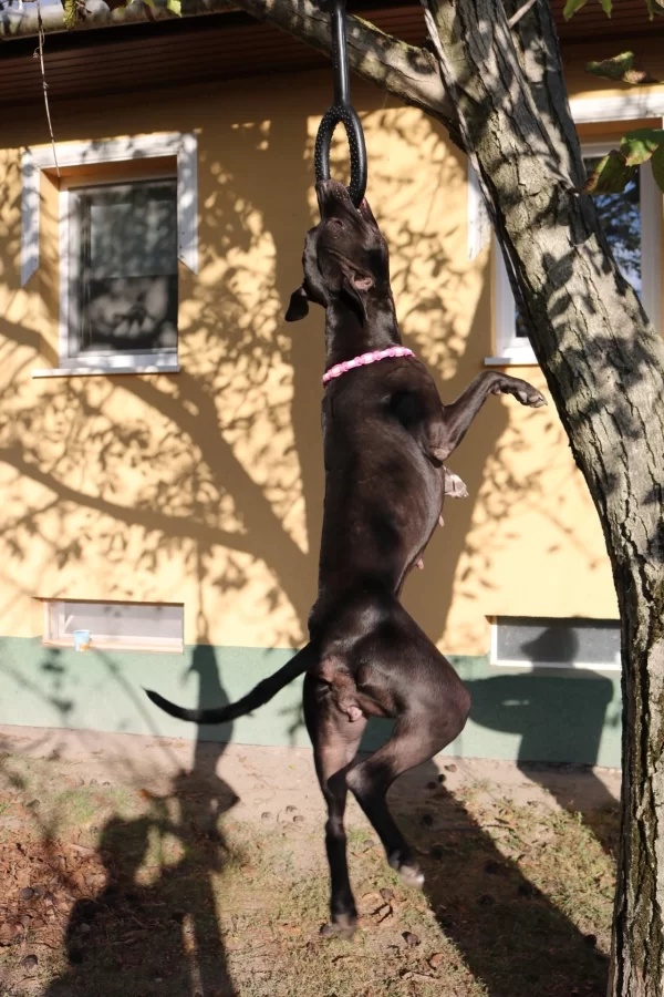 Egy pont alá veszem mindkettőt, mivel nagyon hasonlóak. Mindkettőhöz kiváló megoldás a Playdog játék. A lógatásról már írtunk egy korábbi cikkünkben, egy jól variálható edzésmód, amit fára vagy valamilyen állványra felrögzített játékkal tudunk űzni. A lógás történhet tisztán a levegőben vagy úgy, hogy a hátsó lábak leérnek a földre, esetleg ezt a kettőt egy tréning alkalmán belül is váltogatva. Megmozgatja a nyak- és hát izmait, a hasizmokat, és ha leér a földre, a lábakat is, no és persze folyamatosan fejleszti a rágóizmokat (ettől lesz hatalmas és markáns egy kutya feje). Ezt tudjuk még érdekesebbé tenni, ha fogunk egy autógumit, egy láncot és a Playdog-ot vagy harapópárnát ehhez rögzítjük. Itt már kevésbé lesz fontos, hogy a rendszer rugalmas legyen, mivel a kutya végig mozgatni tudja majd a gumit.